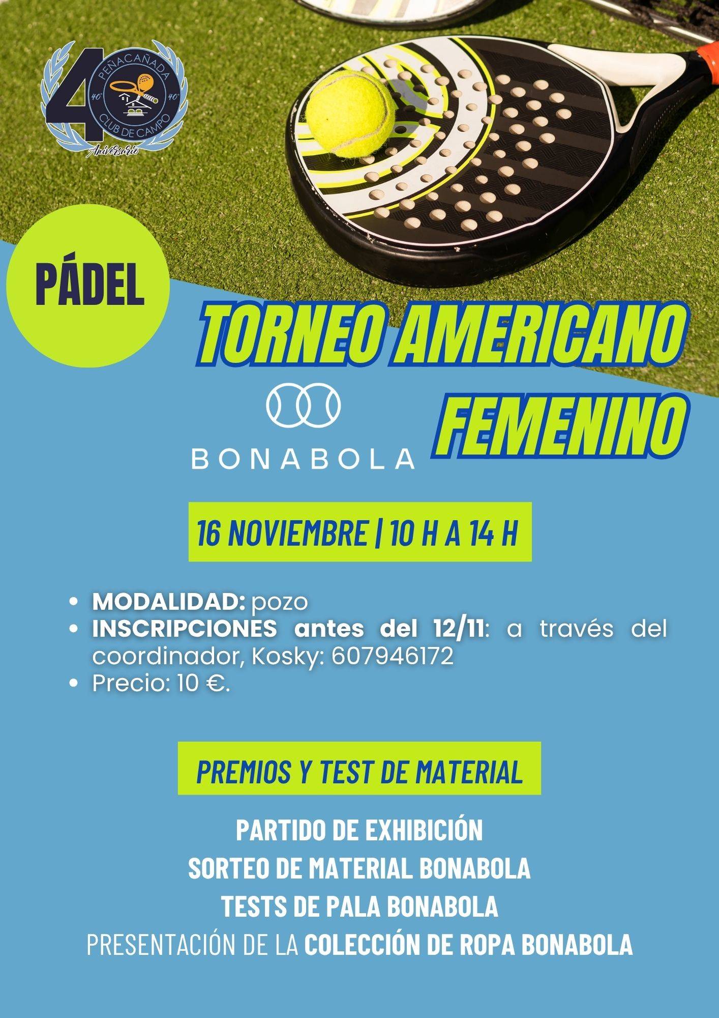 El domingo 16 de noviembre, de 10:00 a 14:00 h, tenemos una cita especial en Peñacañada: el Torneo americano femenino Bonabola en modalidad “pozo”. Una mañana para competir en un formato dinámico y divertido. Al terminar el americano, cerraremos con un partido de exhibición para disfrutar del mejor pádel.