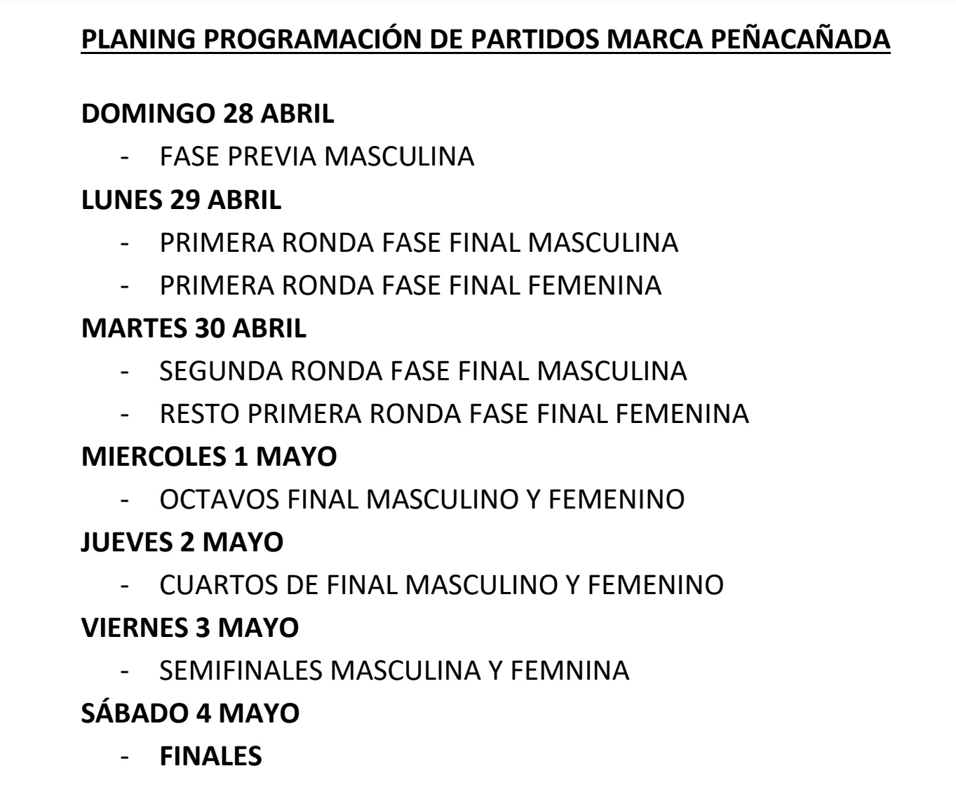 A continuación se detalla el orden de juego de hoy martes 30 de abril de los jugadores de la Escuela de Peñacaña: